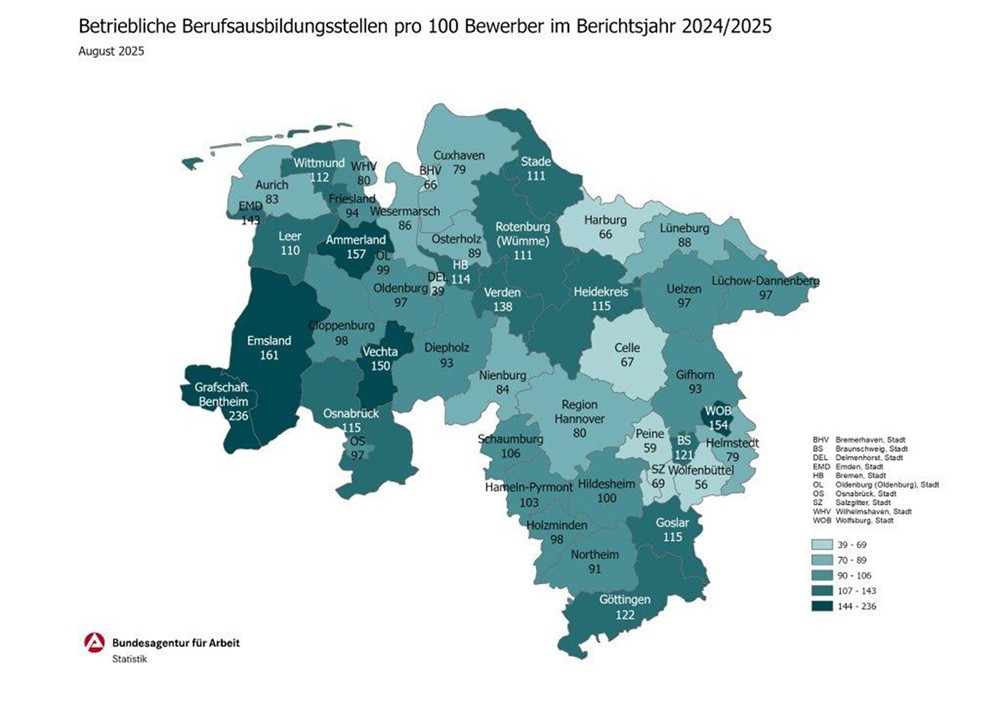 Während die Kammern die eingetragenen Ausbildungsverhältnisse zählen, stellt die Arbeitsagentur die registrierten Bewerberinnen und Bewerber den gemeldeten Lehrstellen gegenüber. Das Verhältnis ist dabei relativ ausgewogen, trotz eines Rückgangs der angebotenen Ausbildungsplätze um 4,2 Prozent. Zwischen Anfang Oktober 2024 und Ende August dieses Jahres zählte die Arbeitsagentur 46.570 betriebliche Stellen, denen im gleichen Zeitraum insgesamt 46.081 Ausbildungsplatzsuchende gegenüberstanden. Rechnerisch, so die Arbeitsagentur Niedersachsen-Bremen, kamen Ende August landesweit auf 100 angebotene betriebliche Ausbildungsstellen 100 Bewerberinnen und Bewerber. Vor Jahresfrist lag die Zahl der Interessenten noch etwas niedriger.