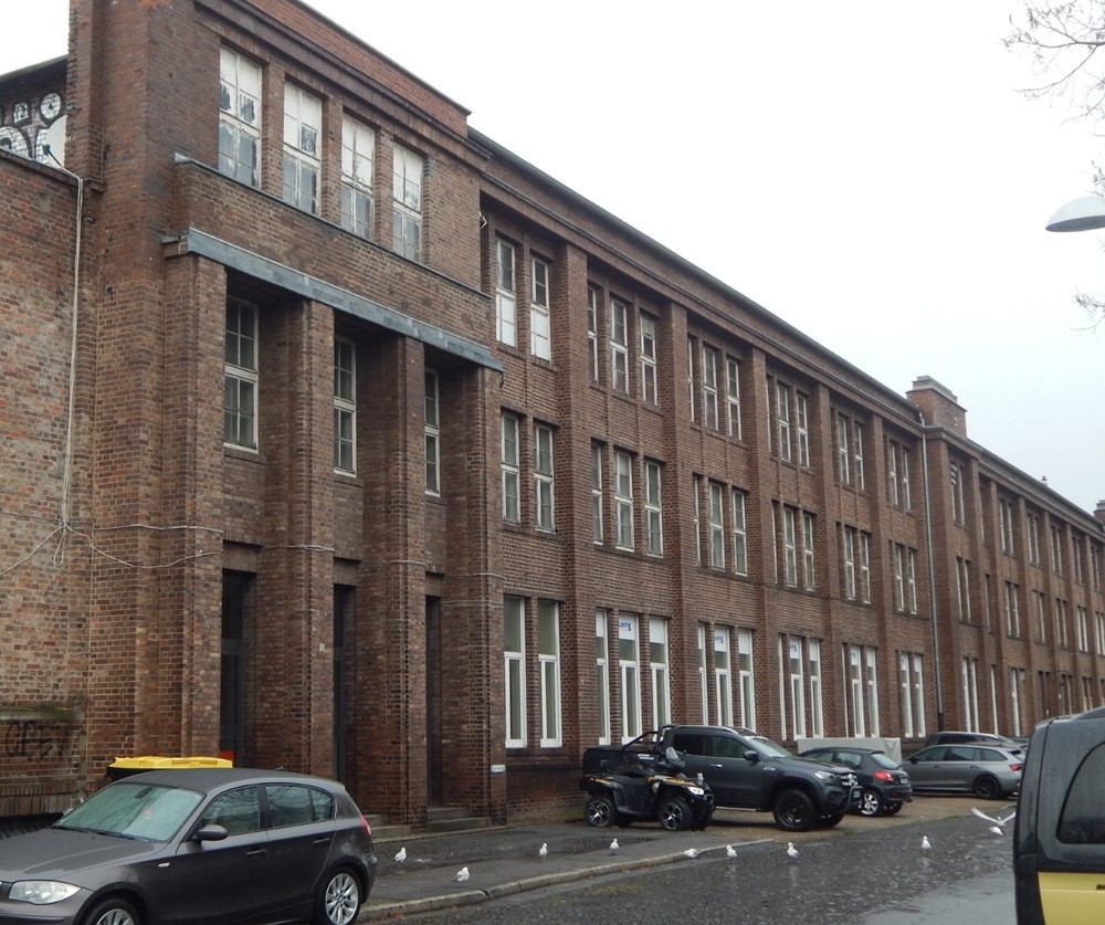 Außenansicht des neuen Hawa Gebäudes aus Backstein mit geparkten Autos davor